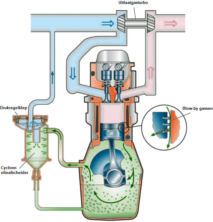 The remaining oil droplets are returned to the crankcase via a hose. The air pushes the pressure control valve upward against the spring force and is directed to the engine intake. The image shows the turbocharger drawing in this air.