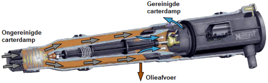 The images below illustrate the positions of the labyrinth and cyclone oil separators. The crankcase vapor enters the labyrinth (left). In the labyrinth, large oil residues are separated from the passing air. From the labyrinth, the crankcase vapor moves into the cyclone section to remove the last oil residues from the air.