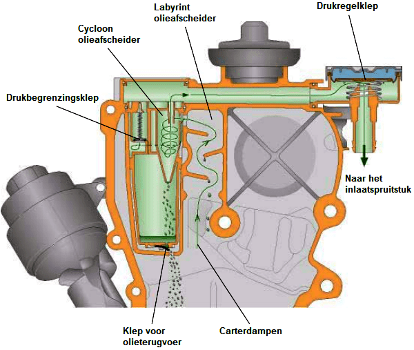 Since this configuration is positioned after the throttle, there is more vacuum in the crankcase breathing system (a stronger suction effect). Therefore, a pressure regulator is required. A pressure regulator is located between the oil separator and the intake pipe, opening only at a certain crankcase pressure. Without overpressure in the crankcase, the pressure regulator remains closed.