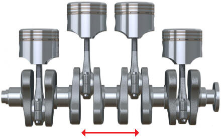 The crankshaft is also equipped with thrust bearings at a main bearing (flywheel side or center). These bearings are designed to absorb axial forces (in the longitudinal direction) on the crankshaft resulting from clutch engagement, acceleration, and deceleration.