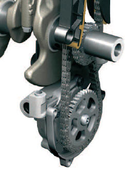 The oil pump is directly driven by the crankshaft. The drive can occur via gears, or alternatively through a chain (see image). Click here for more information on the oil pump.