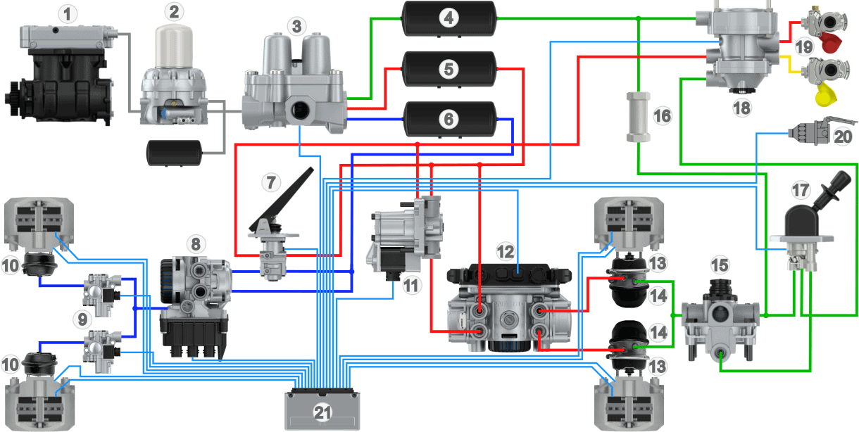 The image below shows an overview of the pneumatic brake system with EBS. We recognize most components from the pneumatic brake system which is discussed in detail on other pages on this website. In the unit beneath the brake pedal there is a so‑called brake value sensor (7), which uses sensors to register the pedal travel. This can be done by measuring the distance the brake pedal travels using distance sensors (Knorr) or by means of potentiometers (Wabco). The pedal travel is sent by sensors to the EBS computer (20). Via CAN bus the EBS computer controls the front axle modulator (8) and rear axle modulator (12) to pass the desired brake pressure to the brake boosters. On the front axle we find separate ABS solenoid valves (9), which are integrated in the rear axle modulator. The EBS computer sends the brake signal via the connector (20) to the trailer or semitrailer.