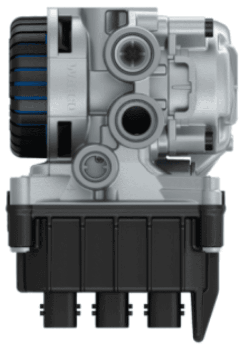 The front axle modulator receives the electrical brake signal from the EBS computer and converts this signal into the desired brake pressure. The opening between the air pressure in the reservoir is passed on to the ABS valve, and thus to the diaphragm cylinder. The electrical signal from the ECU determines to what extent the modulator passes on the brake pressure. This makes the front axle modulator an electrically controlled relay valve.