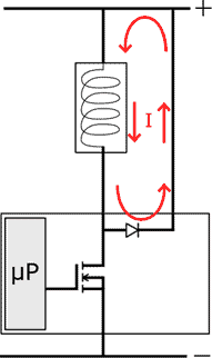 The diagram with the fault shows the contact resistance in the positive wire of the coil. The red arrows indicate the direction of current with the FET switched off. Thanks to this circuit, the current can decrease slowly.