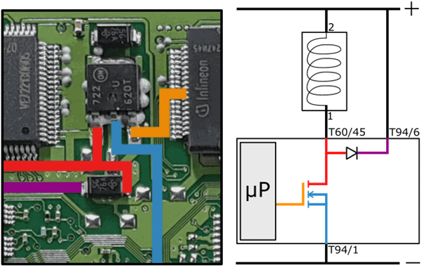 At the moment the gate receives a control voltage from the microprocessor, the FET starts conducting and current can flow from drain to source and thus also through the coil. The magnetic field energizes the coil and closes the fuel pressure control valve.