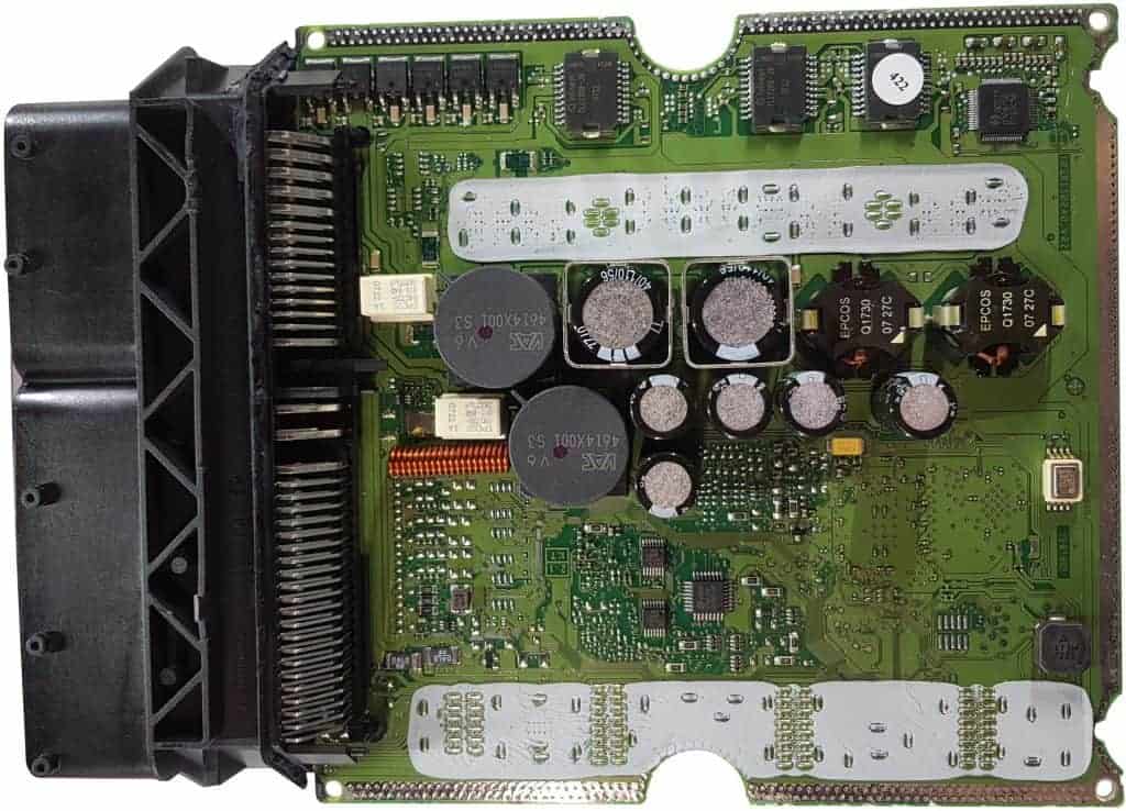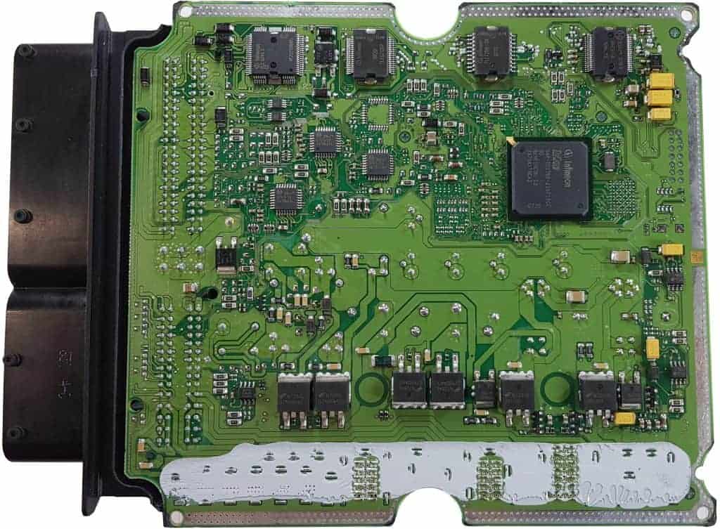 The two images below show the inside of an engine control unit. The covers have been removed. In this paragraph, we use a diagram and the connections to show an example of the circuit of a PWM-controlled valve. First, take a look at the top and bottom side of the PCB.