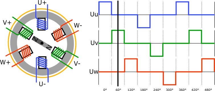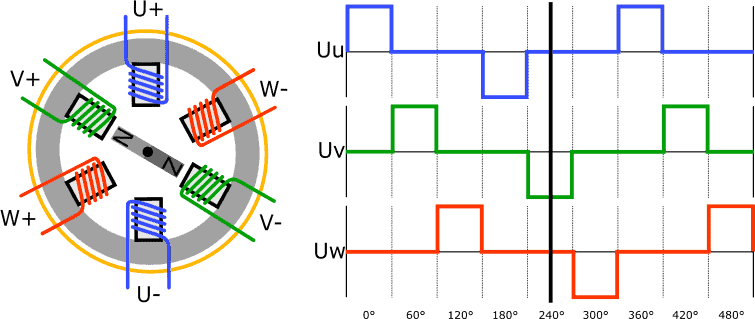 The stator often contains three or six coils (U, V, and W) and the rotor is a permanent magnet. The image below shows the schematic structure of the DC motor along with the voltage pattern through the three coils. In reality, multiple Hall sensors are placed between the poles to determine the rotor position.