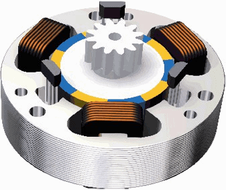 Multiple magnetic poles (north and south) are fixed to the housing. Between the north and south pole exists a magnetic field. The output shaft (the armature) rotates due to changes in the magnetic field.