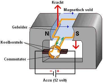 Between the resulting magnetism in the armature (the conductor) and the field (the permanent magnets), a force arises (red arrows in the image). This force ensures that the armature and the commutator rotate around their axis. The brushes then touch the other part of the commutator, reversing the current direction in the armature. The magnetic field and force are built up in the same direction, allowing the armature to rotate around its axis again.
