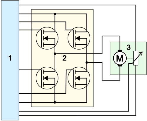 - The FETs (2) supply the electric motor (3) with positive and ground. Depending on which two FETs are brought into conduction, the upper brush is positive and the bottom is ground, or vice versa;