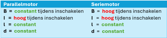 The table above shows that the I (current) is high for both motors, but the B (magnetic flux) is high for the series motor during engagement while it remains constant for the parallel motor.