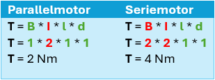 If you prefer calculating with numbers instead of reasoning with 1 or 2 for constant or high, you can view the filled-out formulas below, comparing the parallel and series motors. In this case, the magnetic flux (B) and the starting current (I) are variables, and l and d are equal to each other. The torque of the series motor is also significantly higher in this case.