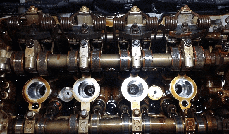 The photo below shows two situations: the same type of engine with good, preventive maintenance (left) and an extremely contaminated engine that has driven 100,000 km with the same oil (right). In addition to the black deposits on the camshaft (black sludge), the engine components have also turned reddish-brown. This is usually the result of old engine oil and an excessively high temperature due to an oil level that is too low.