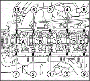 - Installing: start at the innermost camshaft bearing and go diagonally toward the outside (see the image from 1 to 10);