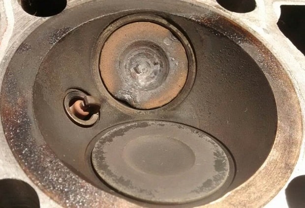 The following image shows a burnt exhaust valve. The valve head shows deformations with discoloration. A burnt valve causes compression loss: in the closed position the valve must retain the air during the compression stroke, but in this case it will not seal properly. During the compression stroke, part of the air escapes past the valve to the exhaust. Although an exhaust valve gets much hotter than an intake valve, an intake valve can also burn.