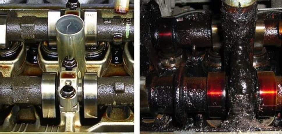 The photo below shows two situations: the same type of engine with good, preventive maintenance (left) and an extremely contaminated engine that has driven 100,000 km with the same oil (right). In addition to the black deposits on the camshaft (black sludge), the engine components have also turned reddish-brown. This is usually the result of old engine oil and an excessively high temperature due to an oil level that is too low.