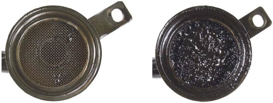 The following image shows an example of an oil pickup screen in good and contaminated condition. It goes without saying that less oil can pass through the heavily contaminated screen: due to this blockage the oil pump is less able to circulate the oil through the engine.