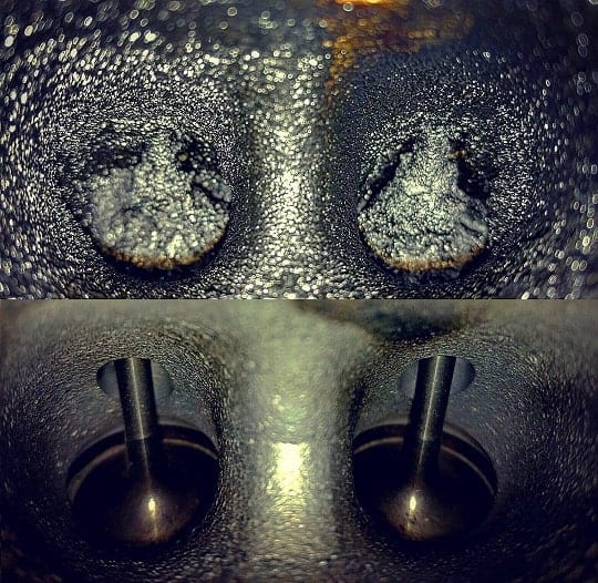 Engine damage is not always directly the result of contamination. When we discover extreme contamination of the intake valves, this has led to complaints such as reduced power, an illuminated engine management light with a negative fuel trim appearing during readout, but it has not directly caused lasting damage. A professional cleaning (carbon / wallnut blasting) can make the complaints disappear. If, nevertheless, one continues driving with the extremely contaminated valves, damage can eventually occur because the valves can no longer seal properly on the valve seats in the cylinder head.