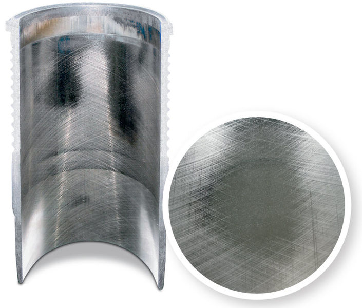 In engines with high oil consumption or rocking pistons, we often see wear of the piston coating and bright spots in the cylinder liner. In certain areas, the honing marks are worn away and have become smooth. Causes may include: