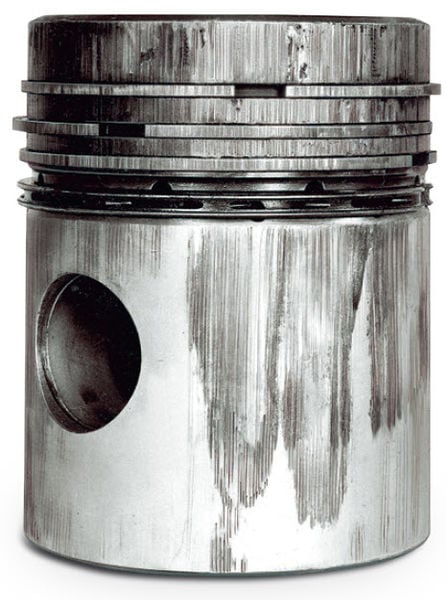 Severely aged and contaminated oil, oil with an incorrect viscosity index, or a lack of oil cause lubrication problems. This can be a cause of scoring on the piston skirt. When the oil film breaks down, dark-colored scoring marks occur. Usually this surface is not shiny and the piston damage mainly occurs on one side (thrust side).