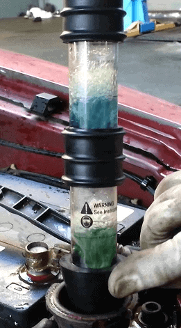 The tester contains blue test fluid. By repeatedly squeezing and releasing the bulb at the top of the tester, air is drawn in. The fluid inside the tester changes from blue to green upon detecting CO (carbon monoxide). When the fluid turns green, it is certain that carbon monoxide is present in the coolant and that there is most likely a head gasket defect.