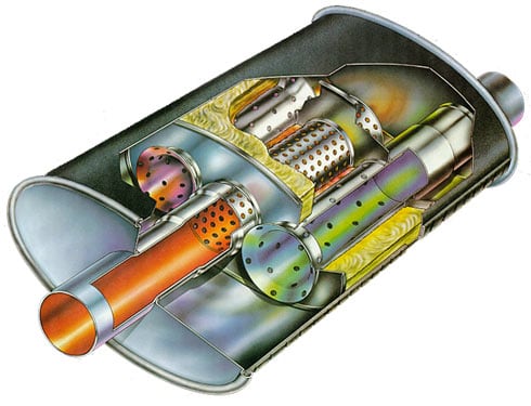 Sound reduction is not only achieved by slowing the airflow but also by sound wave interference within the muffler. There are so-called speaker effects in the muffler where sound waves counteract each other at certain points through acoustic interference. This process effectively attenuates both low and high frequencies of the exhaust noise.