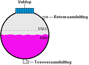 Car manufacturers may use different types of expansion tanks. Sometimes a transparent tank is chosen and other times an opaque tank with a plastic float element. The image shows a transparent tank with minimum and maximum markings. The coolant level must stay between these markings, preferably at maximum. The advantage of this type of tank is that the cap does not need to be removed to check the fluid level. This type of tank is often used in brands like V.A.G.