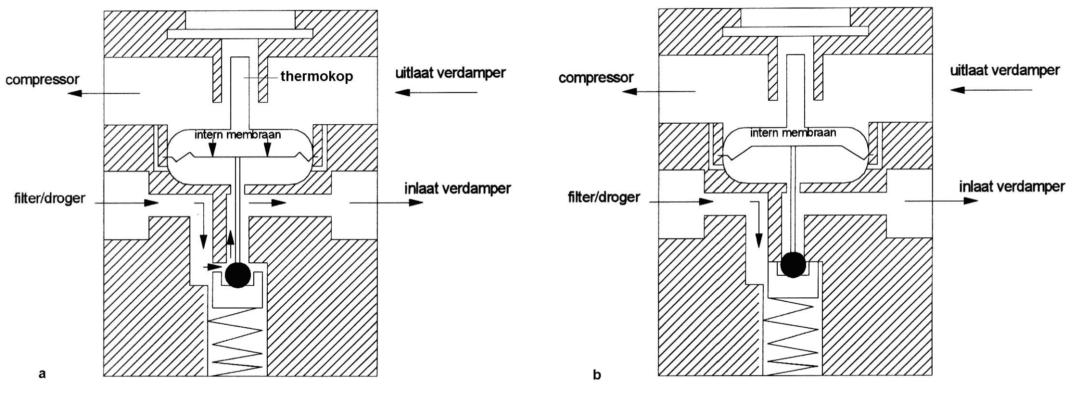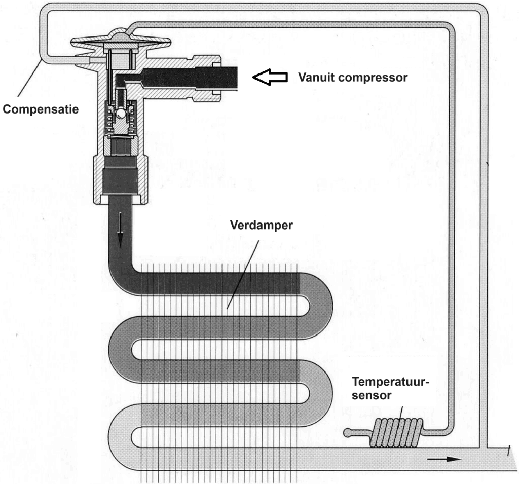 The thermostatic expansion valve consists of two parts, namely the measuring section and the sensor or bulb, which is connected to the actual expansion valve. The measuring section is filled with gas and is located at the outlet of the evaporator. When the temperature at the outlet of the evaporator rises because too little refrigerant is passing through, the gas expands and the pressure increases. The pin then pushes the ball off its seat, allowing more refrigerant to flow into the evaporator and the outlet temperature to drop again. The ball is released as soon as the force on the diaphragm from the sensor becomes greater than the sum of the spring force and the pressure force of the refrigerant at the inlet side of the evaporator. When the temperature after the evaporator becomes too low, the opposite happens. The spring force pushes the ball back onto the seat, the opening narrows and the flow of refrigerant is reduced. The TEV valve therefore keeps the temperature of the refrigerant constant. The thermostatic expansion valve measures the temperature and converts it into pressure. The pressure control activates the valve.