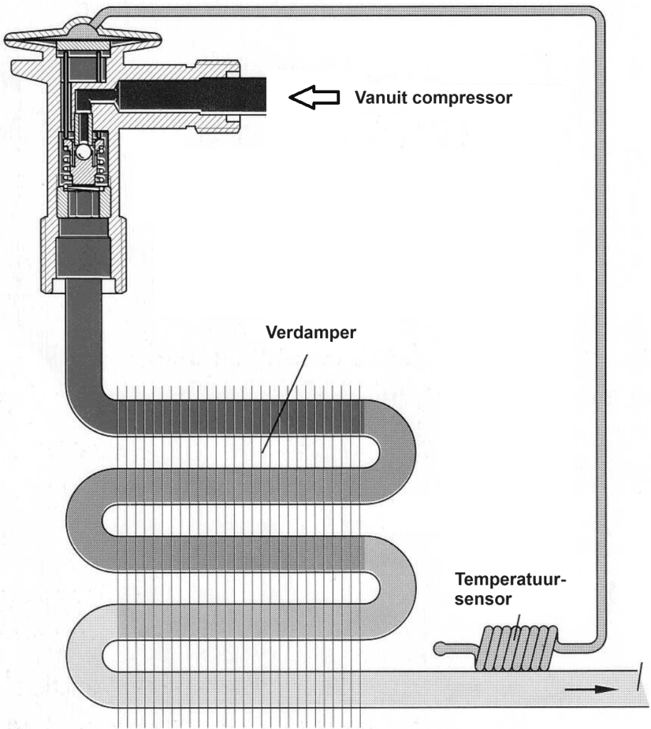 There are different designs. In addition to replacing the capillary, the filter/dryer element is also different. The filter/dryer is located here directly after the condenser and deals with the refrigerant in liquid form. The temperature is measured after the evaporator. If the evaporator temperature becomes too high because too little refrigerant flows through it, the opening is enlarged, allowing more refrigerant to enter the evaporator and the temperature drops again. The thermostatic expansion valve keeps the temperature (and pressure) constant within certain limits. This also means that we can be sure that the refrigerant is drawn in by the compressor in vapor form, so no accumulator needs to be used in the low-pressure section anymore.