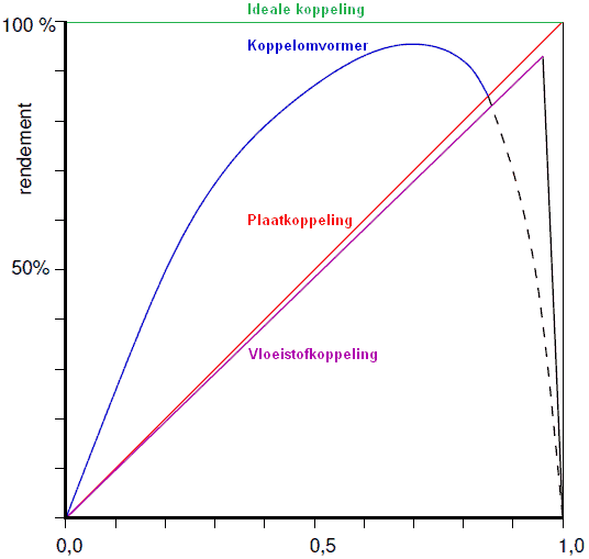 The efficiency of a fluid coupling is nearly equal to that of the plate clutch. However, when almost fully coupled, its efficiency drops significantly, which would cause the drive to fail. A torque converter does not have these characteristics. Due to the internal vanes, the torque is already increased at low speed.