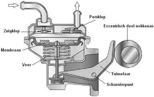 The pump is driven by an eccentric operated by the camshaft. The operation of the rocker arm causes the diaphragm in the center to be pulled downward. The vacuum in this space opens the suction valve, allowing fuel to flow into the fuel chamber. As the eccentric part of the camshaft rotates further, the spring pushes the diaphragm back into place. The pressure in the fuel chamber opens the delivery valve, forcing the fuel out of the pump under increased pressure. The fuel then reaches the carburetor via a line.