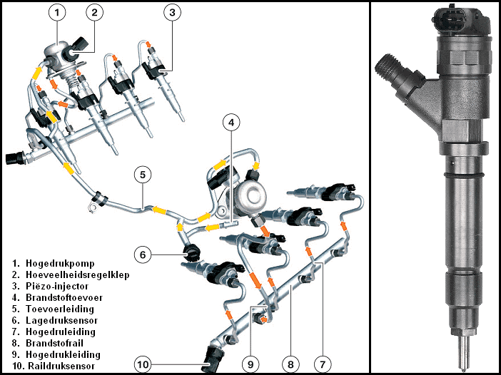 Each injector has a plug connection. This connects each injector to the engine control unit (ECU). The ECU determines, based on core maps (calculated from input signals such as temperature sensors and speed sensors), when and how long each injector sprays fuel. The injection pressure usually ranges around 200 bar with a maximum of about 250 bar (depending on brand/type).