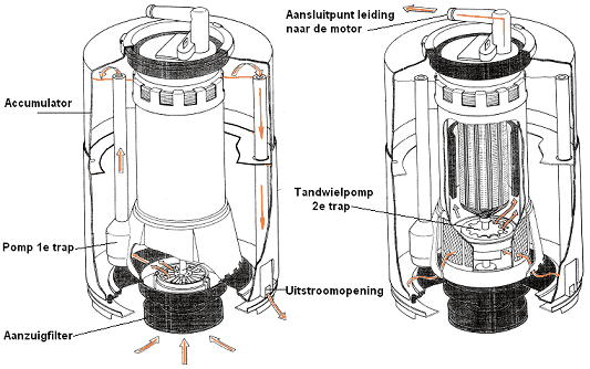 Below is a diagram of a two-stage pump. This type is present in every modern vehicle. These pumps contain two independently operating pump units: the impeller pump (left image) and the gear pump (right image). Both pumps are driven by separate electric motors. The first stage transfers fuel from the tank via the filter to the buffer reservoir, which has a capacity of approximately 600 milliliters. This internal reservoir ensures that when a vehicle makes prolonged turns with a low fuel level, the gear pump (2nd stage) still receives fuel. Without a filled reservoir, all fuel would shift to one side of the tank, causing the pump to be unable to draw any fuel. This system prevents that.