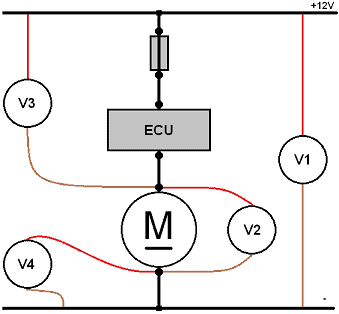 There is a transition resistance in the positive wire. A V4 measurement (see diagram) can help identify this. The V3 (voltage drop in the positive) might show 4 volts, indicating the pump effectively operates with 8 volts instead of 12 volts (measurement V2). When the pump connector is removed, the circuit is interrupted, eliminating the voltage drop from transition resistance. In this case, 12 volts are measured at the connector. A voltage drop only occurs with a closed circuit and active consumer, so the connector should not be removed while measuring. Alternatively, measure under load with a connected lamp.