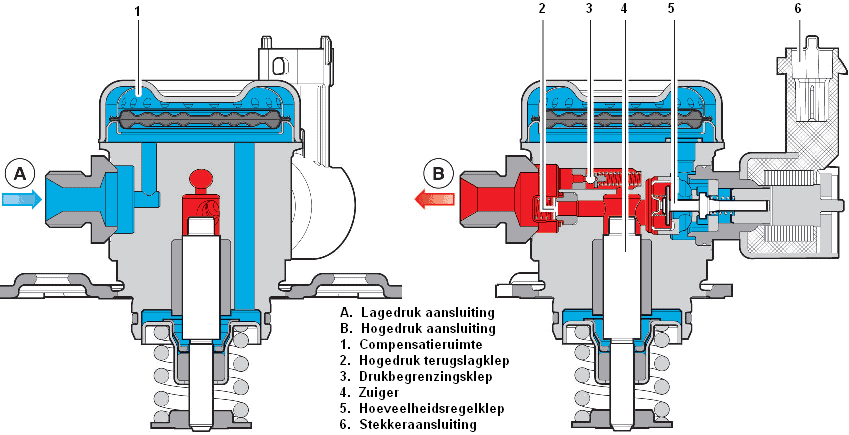 Piston 4 is driven by the camshaft. In its neutral position, the piston is at its lowest point, pressed down by a spring. When the camshaft pushes the piston against the spring force upwards, fuel is compressed through the high-pressure check valve into the line (via connection B). The pressure relief valve (3) opens if the injection pressure is too high. If this valve partially opens during piston compression, some fuel returns to the fuel chamber, lowering the pressure, as with a fully open valve, the fuel pressure before and after the piston is equal. From connection B, the fuel reaches the injectors via the fuel rail, injecting fuel at the end of the compression stroke.