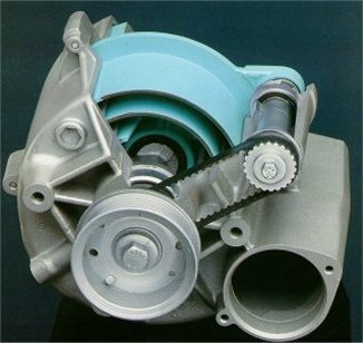 A G-lader is essentially a dual spiral chamber (snail shell) inside. The incoming air arriving in the left outer spiral chamber of the G-lader is displaced by an eccentric motion through the right outer spiral chamber and discharged to the intercooler at a standard pressure of 0.7 bar. The air temperature can rise to 100 degrees Celsius due to compression. The intercooler then cools it down to about 65 degrees. The cooled air is then pressed into the intake manifold.