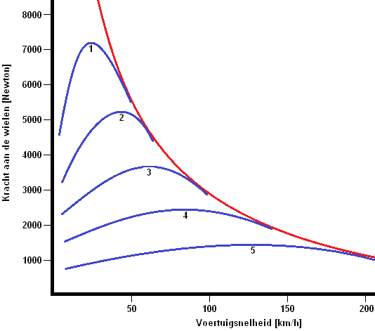 As vehicle speed and gears increase, the force delivered at the wheels decreases. The slope of the blue lines results from the gear ratios, and the descending red line results from driving resistances (rolling and air resistance).