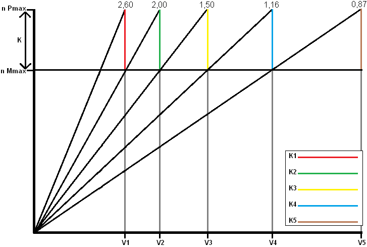 The ratios between the engine speeds and the gears remain the same. All colored lines (K1 through K5) also remain the same. The K-factor is determined by the engine characteristic. The K-factor lies between the engine speeds of the engine’s maximum torque and maximum power. This engine characteristic is used to calculate the transmission ratios of the gearbox. The K-factor for the geometric series can be determined as follows: