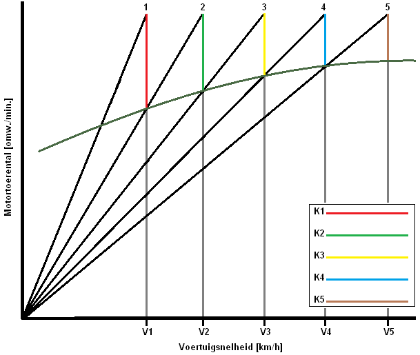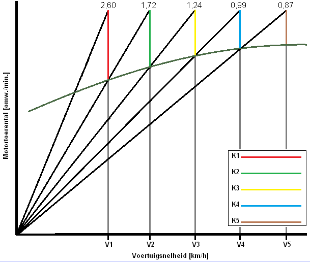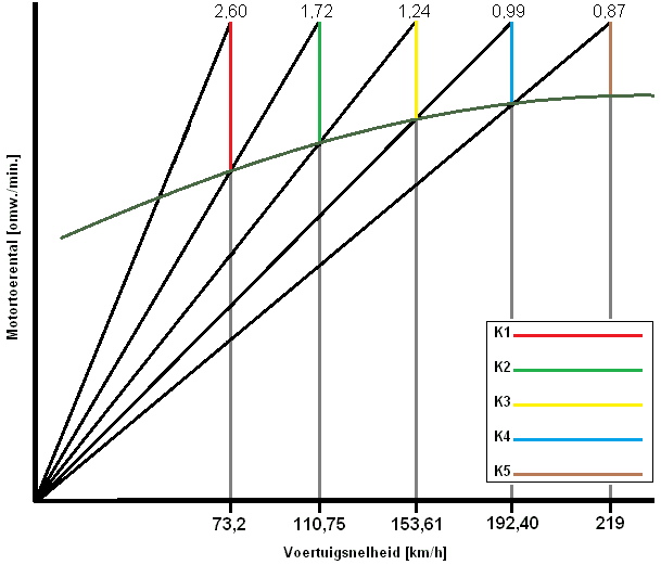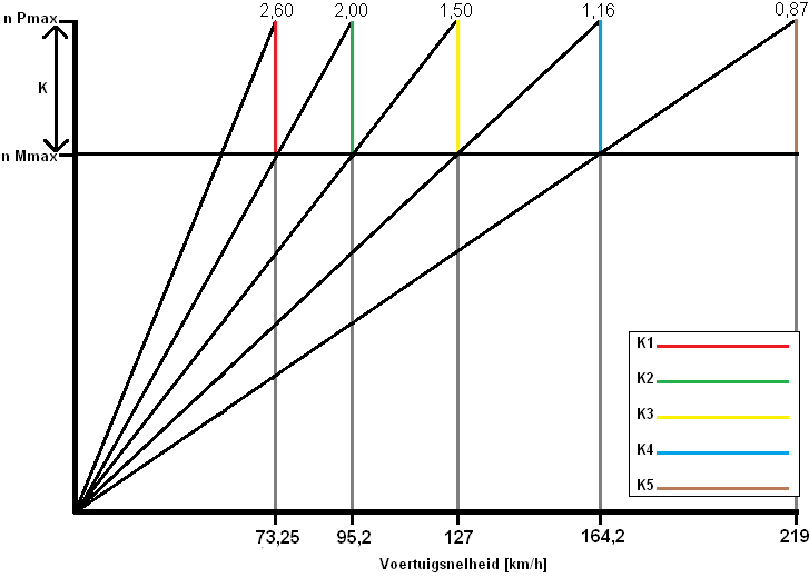 The K-factor is now different for each gear (all colored lines have different lengths), so each needs to be calculated. With the K-factor, the gear ratios of the transmission can be determined. Without knowing the K-factor, the reduction of the lowest or highest gear can still be determined, but the rest of the gears must then be calculated with the K-factor. Then the sawtooth diagram can be drawn.