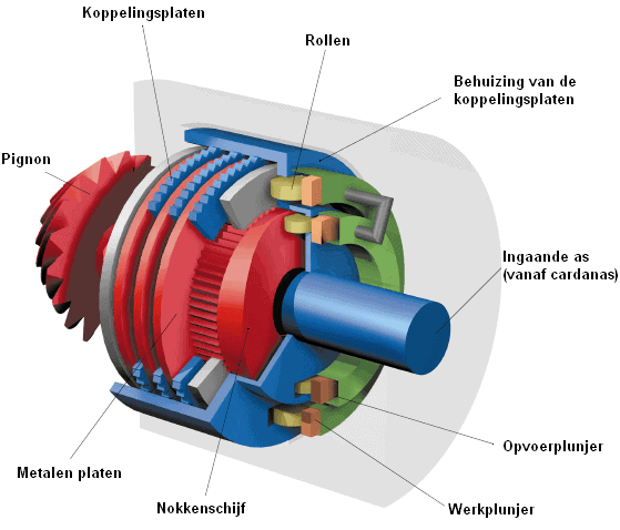 The torque is transferred to the Haldex clutch from the input shaft (the blue shaft in the image below). The pinion drives the differential. When driving straight, the speed of the input (blue) shaft and the output shaft (the red) pinion are equal, because the front and rear wheels rotate at the same speed. There is still drive to the rear wheels because the clutch plates of the Haldex do not lie against each other. When the input and output shafts have a speed difference, for instance, when the front wheels slip and the rear wheels simply roll over the road surface, the (yellow) rollers in the lift plunger (see image below) ensure that the clutch plates are mechanically pressed against each other. The rollers are placed in a narrowing of the cam plate when twist occurs, causing the gray ring to be pushed further inward.