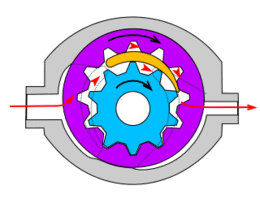 - suction side: the gears separate on the left side. Due to the increase in volume in the cavities, a vacuum of approximately 0.1 to 0.2 bar occurs, causing oil to be drawn in. The gears transport the oil via their outer circumference to the discharge side;