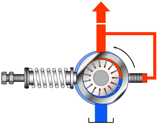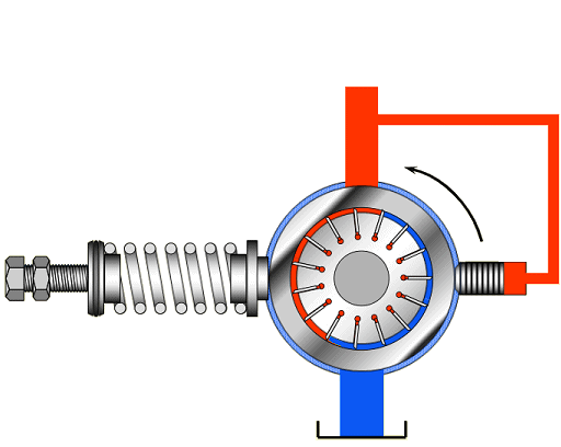 The vane pump has a rotor with radially placed vanes. On the suction side (blue), the volume increases causing a vacuum and oil is drawn in. On the discharge side (red), the volume decreases, overpressure occurs, and the oil is pressed into the line.