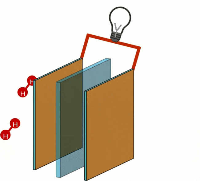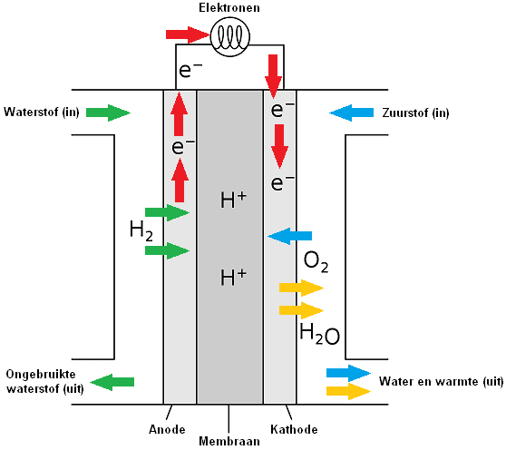 In a fuel cell, hydrogen and oxygen are converted into H+ and OH- ions (particles that are charged). The ions are separated into different chambers of the fuel cell by a membrane. The fuel cell contains two porous carbon electrodes on which a catalyst is applied; at the hydrogen (H) a negative electrode (anode) and at oxygen (O) a positive electrode (cathode).