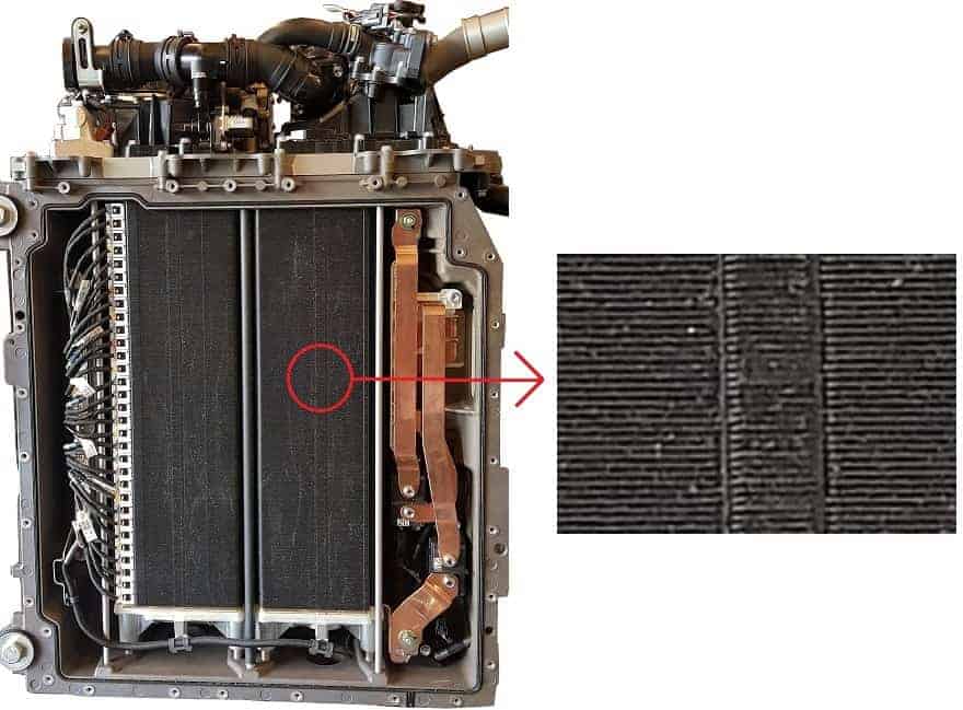 This fuel cell stack is equipped with 370 fuel cells. Each fuel cell provides 1 volt, so a total of 370 volts can be delivered to the electric motor. All the fuel cells are stacked beneath one another. The red circle shows an enlargement where the stacking of the fuel cells is clearly visible.