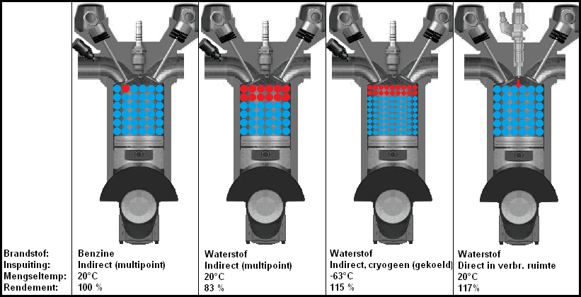 The image below shows four situations with three different types of hydrogen injection. In the second image from the left, hydrogen gas is indirectly injected into the intake manifold. The gaseous hydrogen is heated by ambient temperature. Hydrogen also takes up space, allowing less oxygen to enter the cylinder. This is the situation where the most power loss occurs.