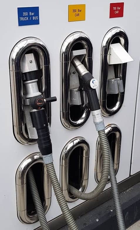 At the time of writing this article, there are only two hydrogen refueling stations in the Netherlands. One of these stations is located in Rhoon (South Holland). The images show the nozzles used for refueling. The fill pressure is 350 bar in commercial vehicles and 700 bar in passenger vehicles.