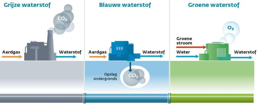Hydrogen can be produced with sustainable energy or based on fossil fuels. The latter is something we try to avoid as much as possible because fossil fuels will become scarce in the future. Also, processing fossil fuels will produce CO2.