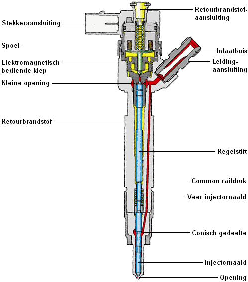 When the engine management sends a signal to the injector, the coil is energized, and the electromagnetically controlled valve is pulled upward. The fuel pressure above the control rod is diverted via a small opening back into the other return fuel line. This causes the fuel pressure above the control rod to drop very quickly. The control rod will move upwards, aided by the conical section located at the bottom of the control rod. The control rod, and thus the injector needle, is raised. At that moment, the opening at the bottom of the injector is cleared, allowing the fuel at the common rail pressure, up to 1300 bar, to be injected into the combustion chamber.
