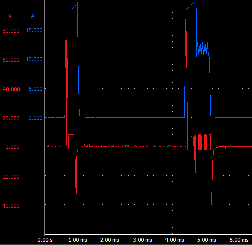 The electromagnetically actuated injector is energized with the electromagnetic coil. When the current through the coil is high enough, the electromagnet overcomes the spring force on the valve. To move the injector needle, a short current and voltage peak are required. The onboard voltage of 14 volts is insufficient to lift the needle from its seat. Within a time frame of only 0.3 nanoseconds (10^-9 seconds), the coil is energized with 20 Amperes at 80 volts (peak). After the injector needle has opened, it is held open with 12 Amperes at 14 volts (hold), until the actuation stops and the needle is pressed back onto its seat by the spring force.
