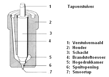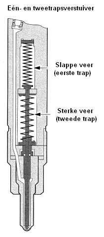 Some manufacturers equip their engines with these so-called two-stage injectors. These are multi-hole injectors, but with two springs; namely a stronger spring and a weaker spring. The weaker spring allows the needle to lift slightly at a lower pressure. This results in a small amount of fuel being sprayed into the cylinder at low pressure; the pre-injection. This initiates the combustion. The injector needle hits a stop that is backed by the strong spring. The pressure will further increase to the normal opening pressure. The needle will then open maximally: the main injection.